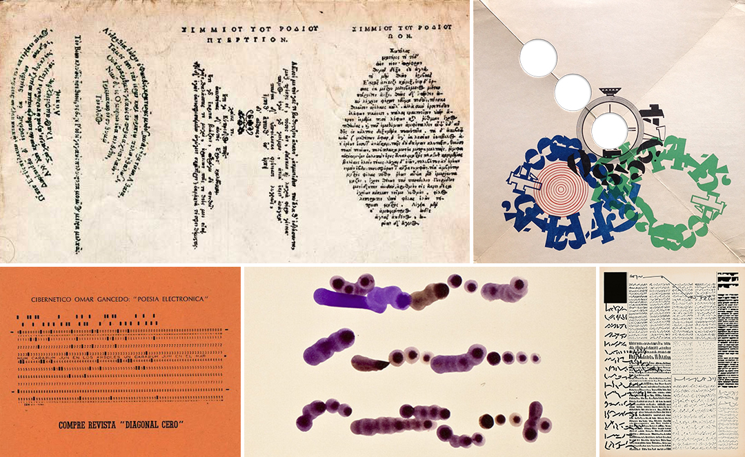 Los antecedentes de la poesía visual se remontan a 300 años antes de Cristo, cuando Simmias de Rodas inventó el caligrama titulado El huevo, uno de los poemas figurados más antiguos que se conservan de Occidente. La lectura que propone no es de arriba hacia abajo sino del centro hacia la periferia, en forma de espiral, a la manera en que eran concebida en la naturaleza las leyes de la creación, sugiriendo con el itinerario de lectura, al mismo tiempo, la forma del huevo y la condición cíclica y perpetua de dicho proceso. El huevo, símbolo de la vida para los griegos, se reconfiguraba en un objeto artístico.